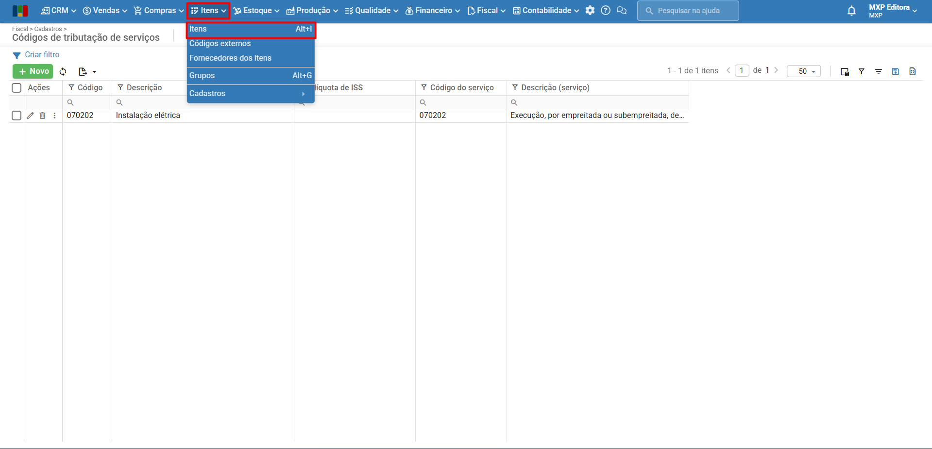 4) Para informar o código de tributação do serviço configurado no cadastro do serviço, acesse a tela “Itens > Itens”.