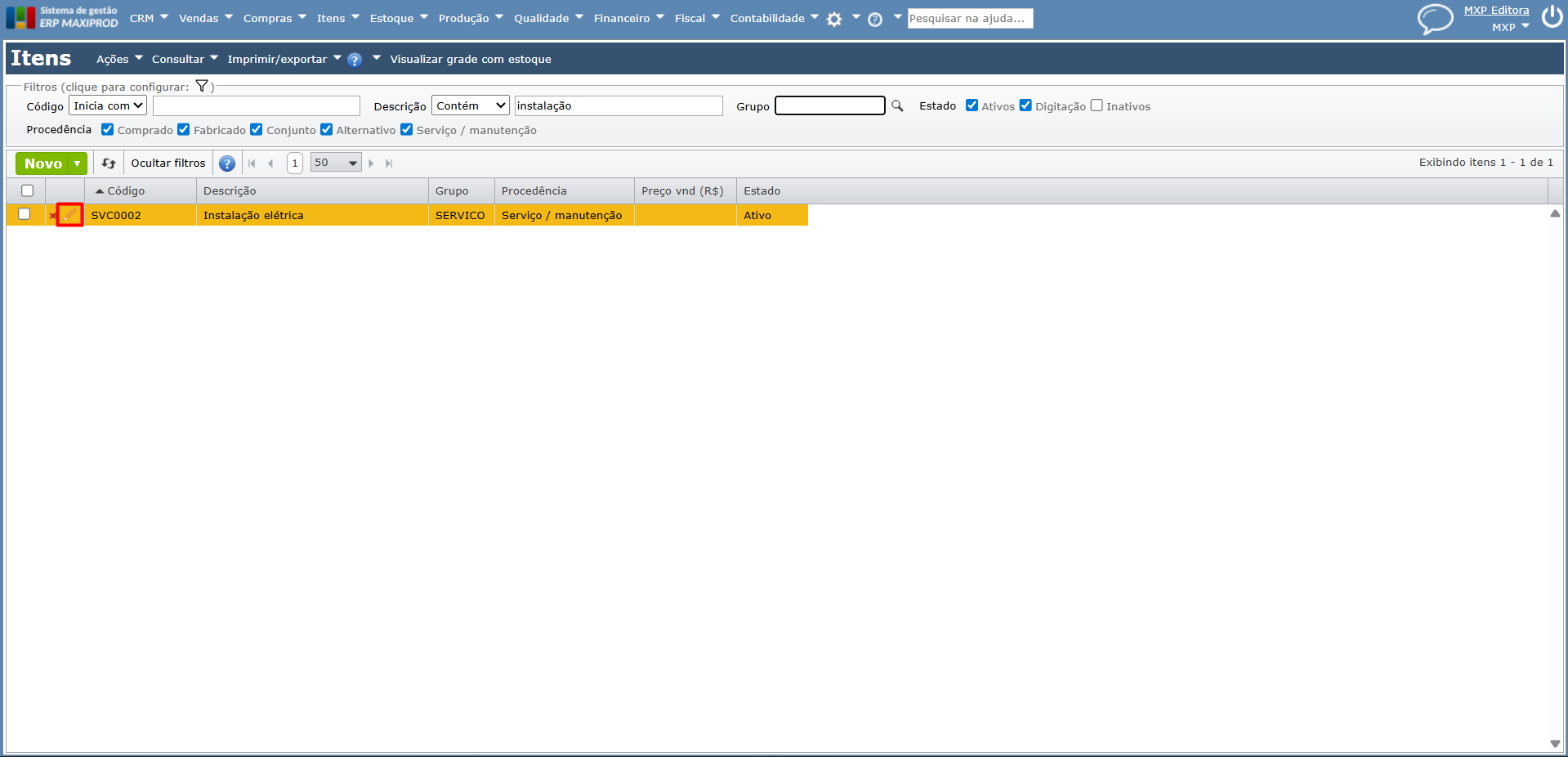 5) Edite o item que representa o seu serviço, clicando no “ícone de lápis”. Para saber mais sobre o cadastro de produtos e serviços, clique aqui.