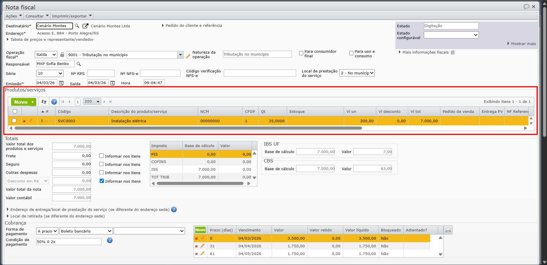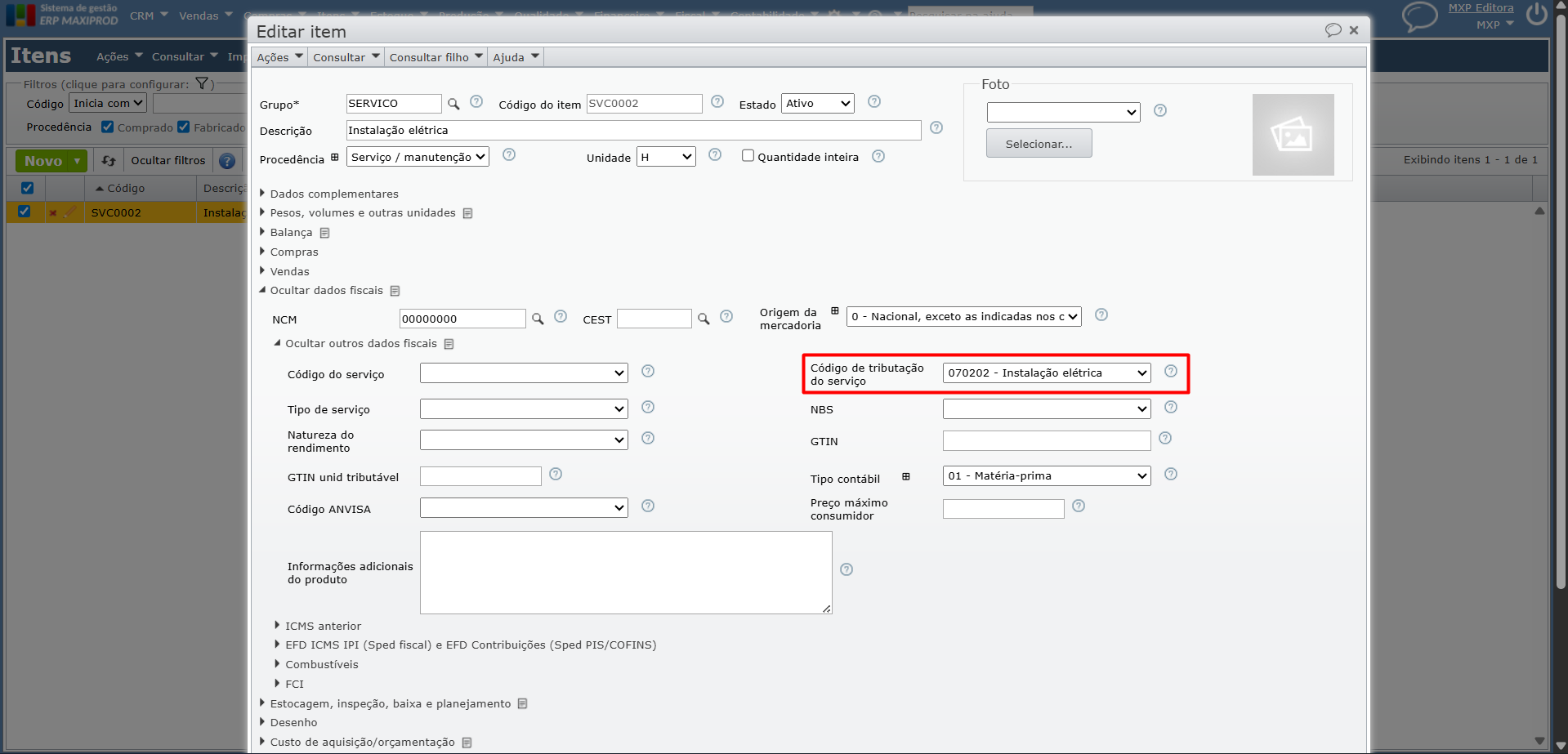 3) Na NFS-e, informe um item que contenha o código de tributação do serviço configurado para a geração do grupo, conforme o primeiro tópico dessa ajuda.