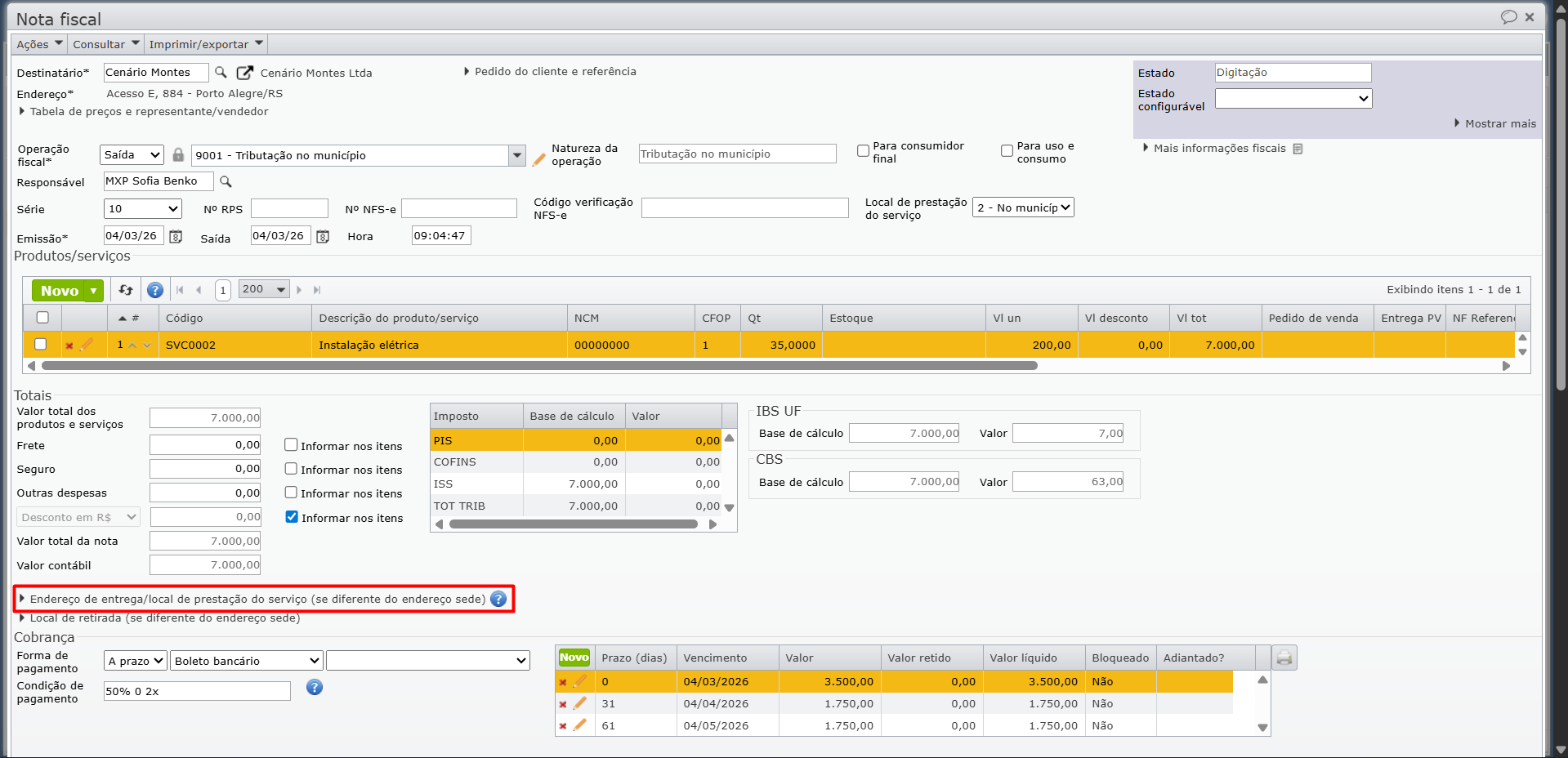 Observação: se o “Endereço de entrega/local de prestação do serviço” não estiver preenchido, será considerado o endereço presente no cadastro do destinatário.