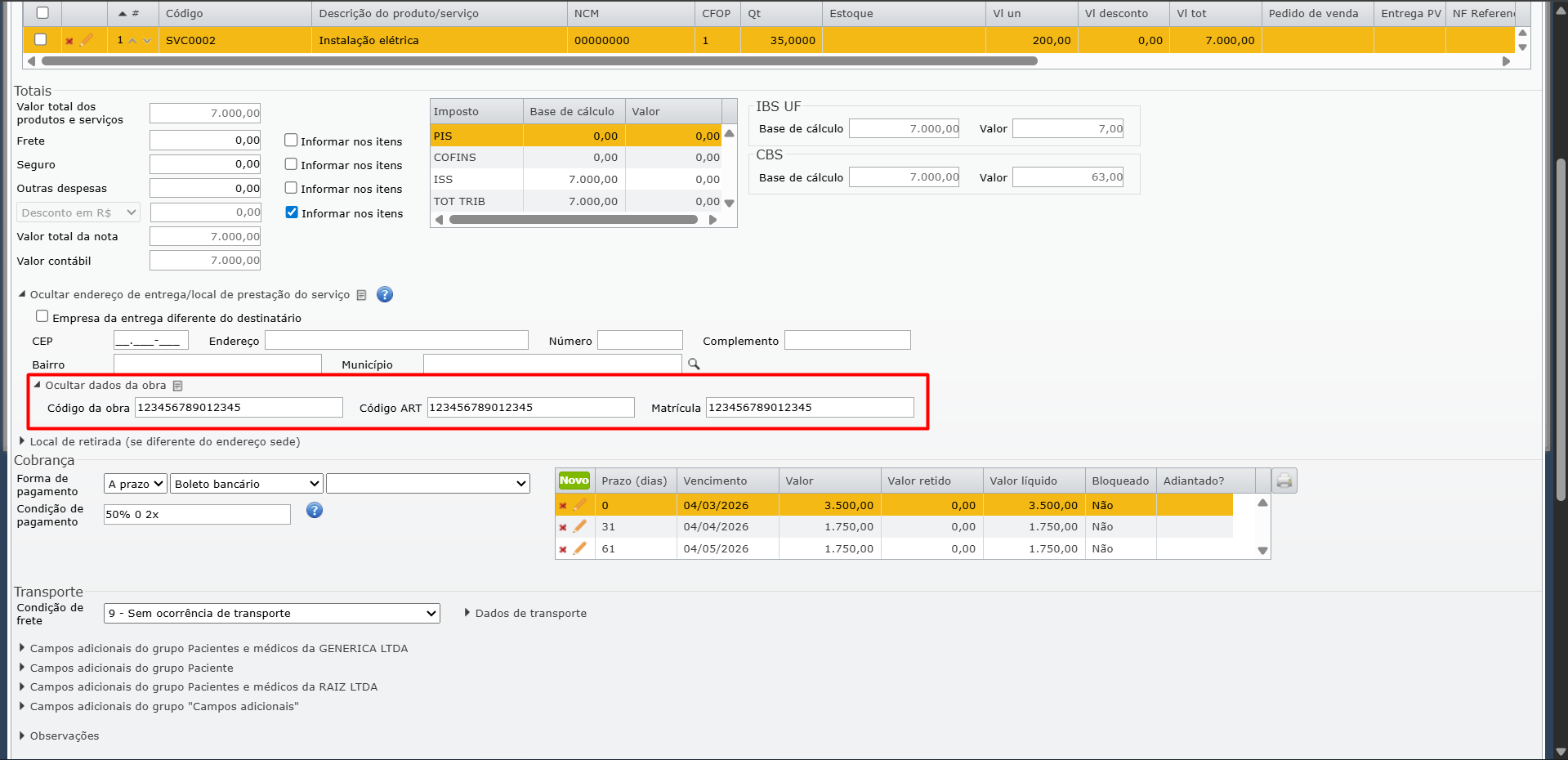 Habilitar grupo de “Obra” no XML da NFS-e.