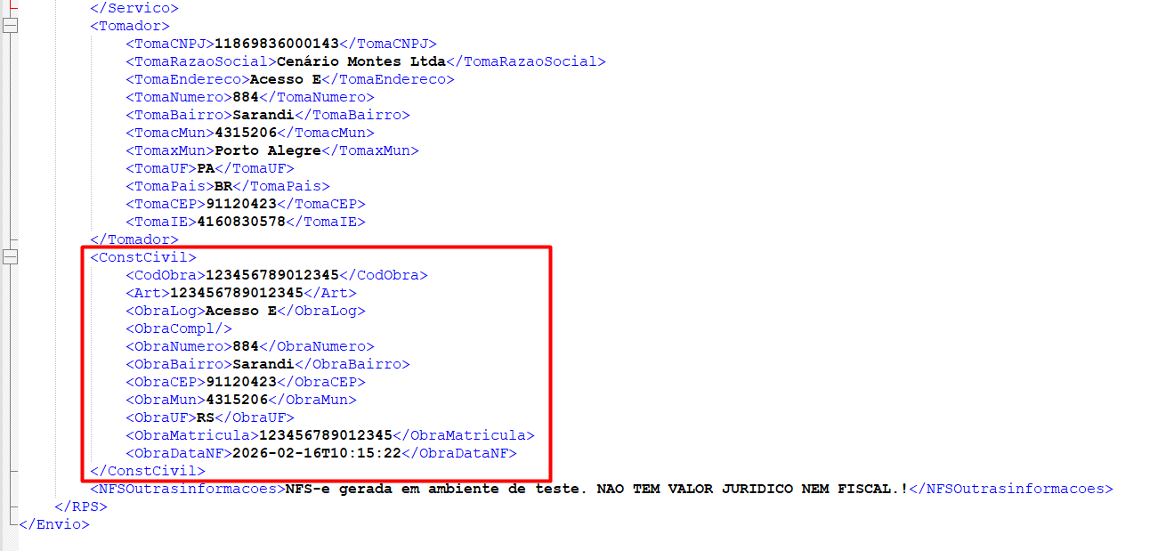 6) Por fim, emita a NFS-e. Ao autorizar, o grupo “ConstCivil” estará presente no XML.