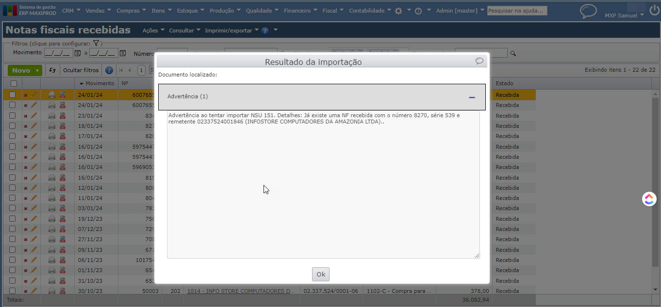7) NFs recebidas que já estão no sistema não são importadas novamente. Ao tentar importar NF já existente no sistema, é retornada a mensagem:
