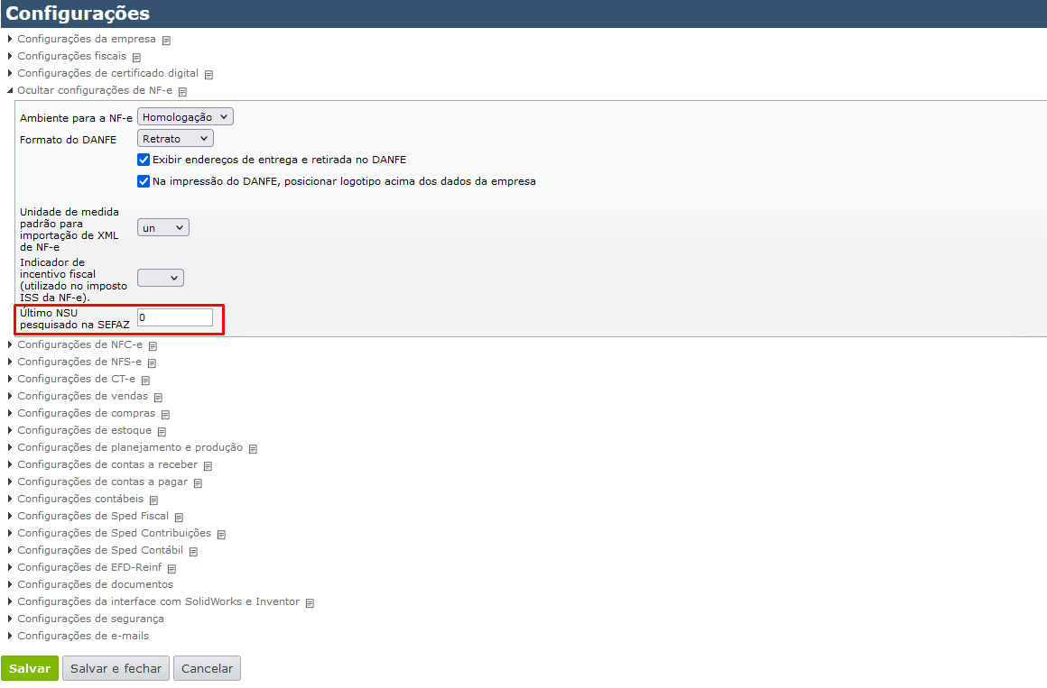 Para evitar que a consulta seja novamente bloqueada, atualize a configuração “Último NSU pesquisado na SEFAZ” conforme o NSU retornado na mensagem “Último NSU retornado“.