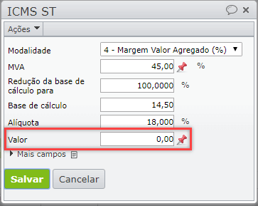 3) Na edição do ICMS ST, zere o campo “Valor”.