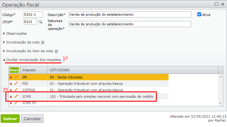 3) Na edição da operação fiscal, expanda o menu “Inicialização dos impostos”.
