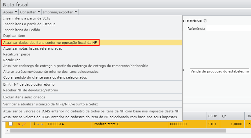 7) Edite a nota fiscal que quer lançar > vá ao menu “Ações” > “Atualizar dados dos itens conforme a operação fiscal da NF”.