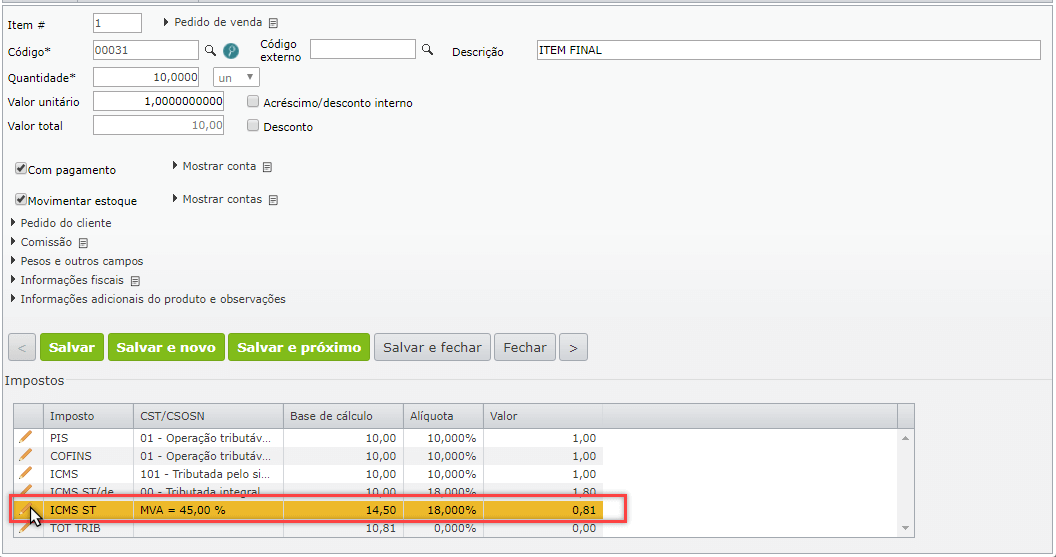 2) Na edição do item, na grade de impostos, clique para editar o ICMS ST.