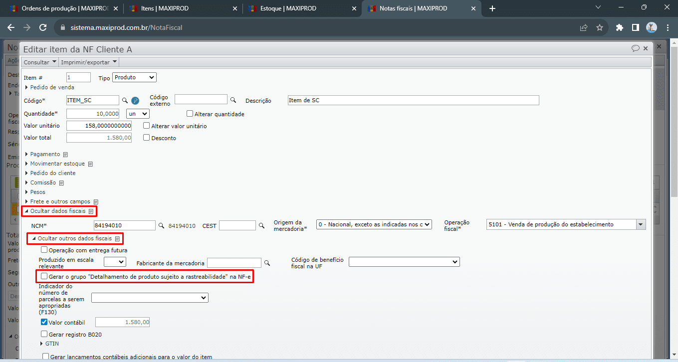 A mensagem “A opção Gerar o grupo “Detalhamento de produto sujeito a rastreabilidade” na NF-e está marcada no item {posição do item} e não foi possível identificar o lote de origem da movimentação do estoque. Movimente um lote válido nesse item ou desmarque a referida opção presente em ‘Dados fiscais’ > ‘Outros dados fiscais’ do item da nota fiscal.” indica que está sendo usado um item com forma de estocagem diferente de “lote do fabricante” ou “número de série” e a opção destacada na imagem anterior na edição do item da nota fiscal foi marcada.