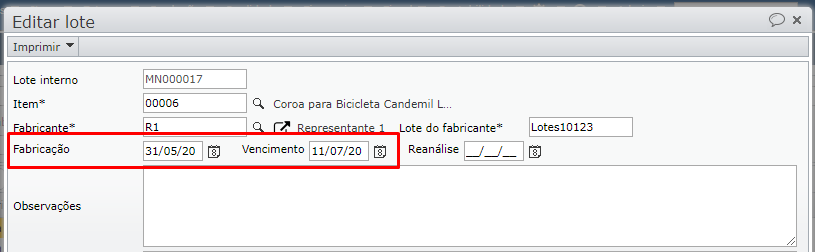 Para utilizar rastreabilidade do produto na nota fiscal, é necessário informar as datas de fabricação e validade do lote, no cadastro de lotes registrados.