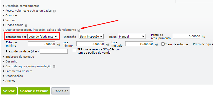 Para definir a forma de estocagem de um item, clique em “Itens > Itens”, duplo-clique sobre o item para abrir sua tela de edição e escolha a forma de estocagem conforme a imagem a seguir: