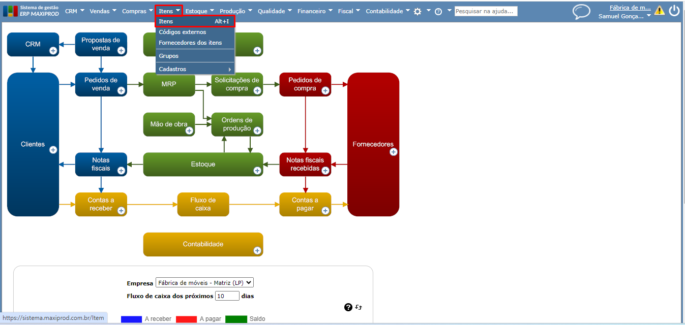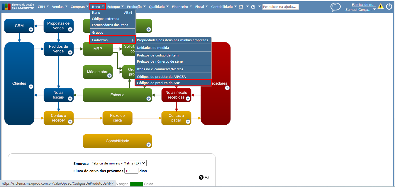 1) Acesse o menu superior “Itens > Cadastros > Códigos de produto da ANP”.
