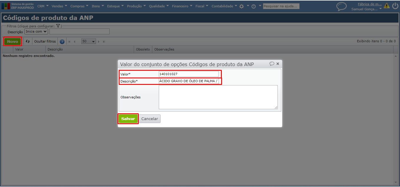 2) Clique no botão verde “Novo”, preencha o “Código do produto na ANP” no campo “Valor” e a “Descrição do produto conforme ANP” no campo “Descrição”. Clique no botão verde “Salvar” para efetivar o cadastro.