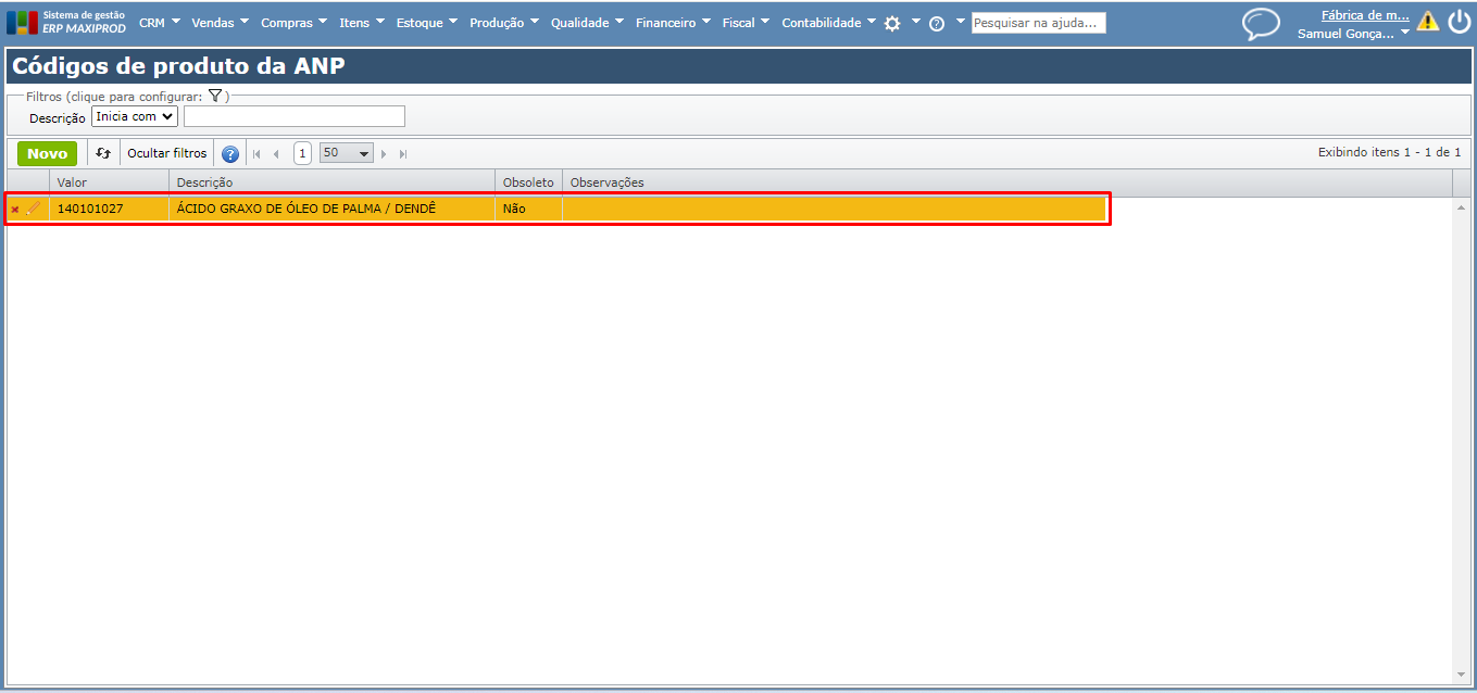 3) O cadastro será salvo na grade de “Códigos de produto da ANP”.