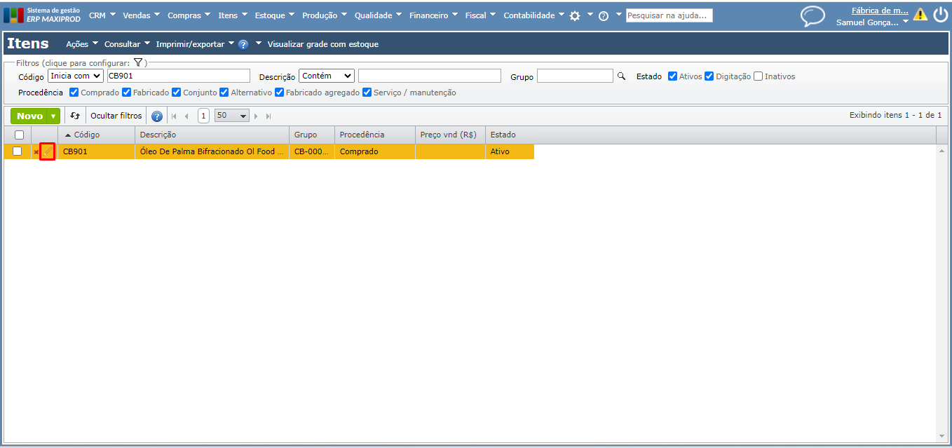 2) Localize o cadastro do item e clique no ícone do lápis para editar.