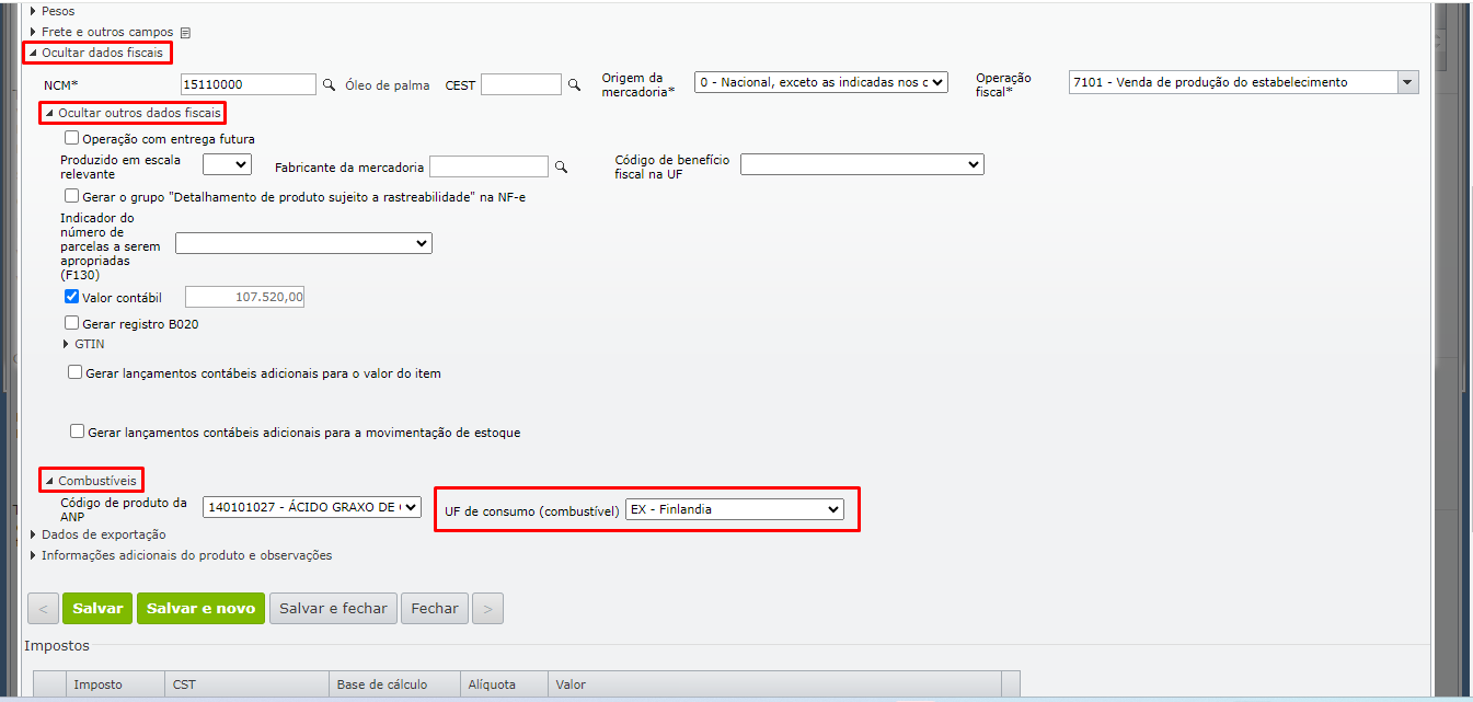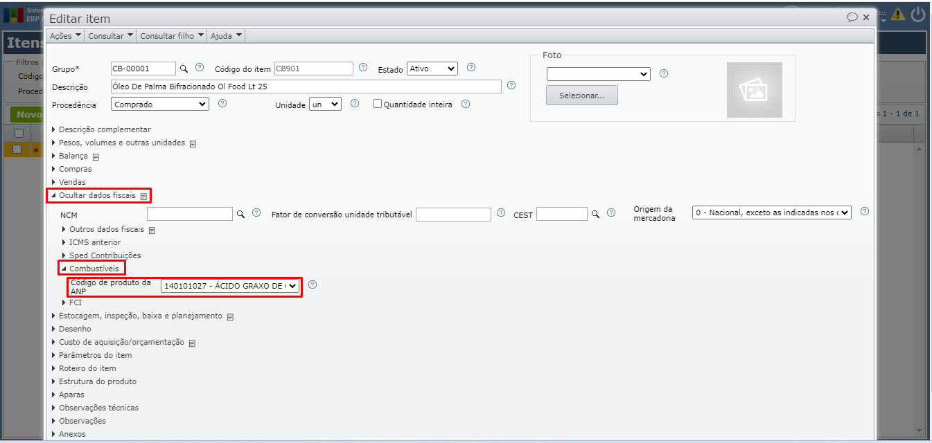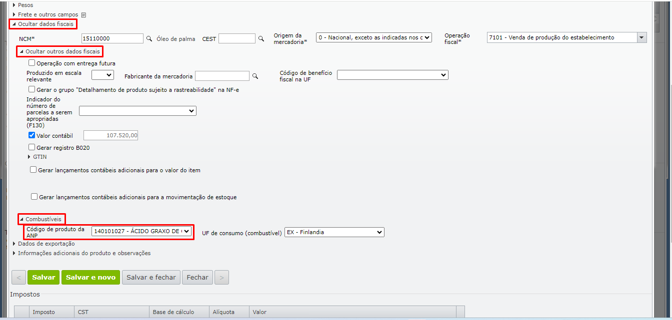 4) Na edição do item da nota fiscal, o campo “Código de produto da ANP” se encontra disponível na seção “Dados fiscais > Outros dados fiscais > Combustíveis”.