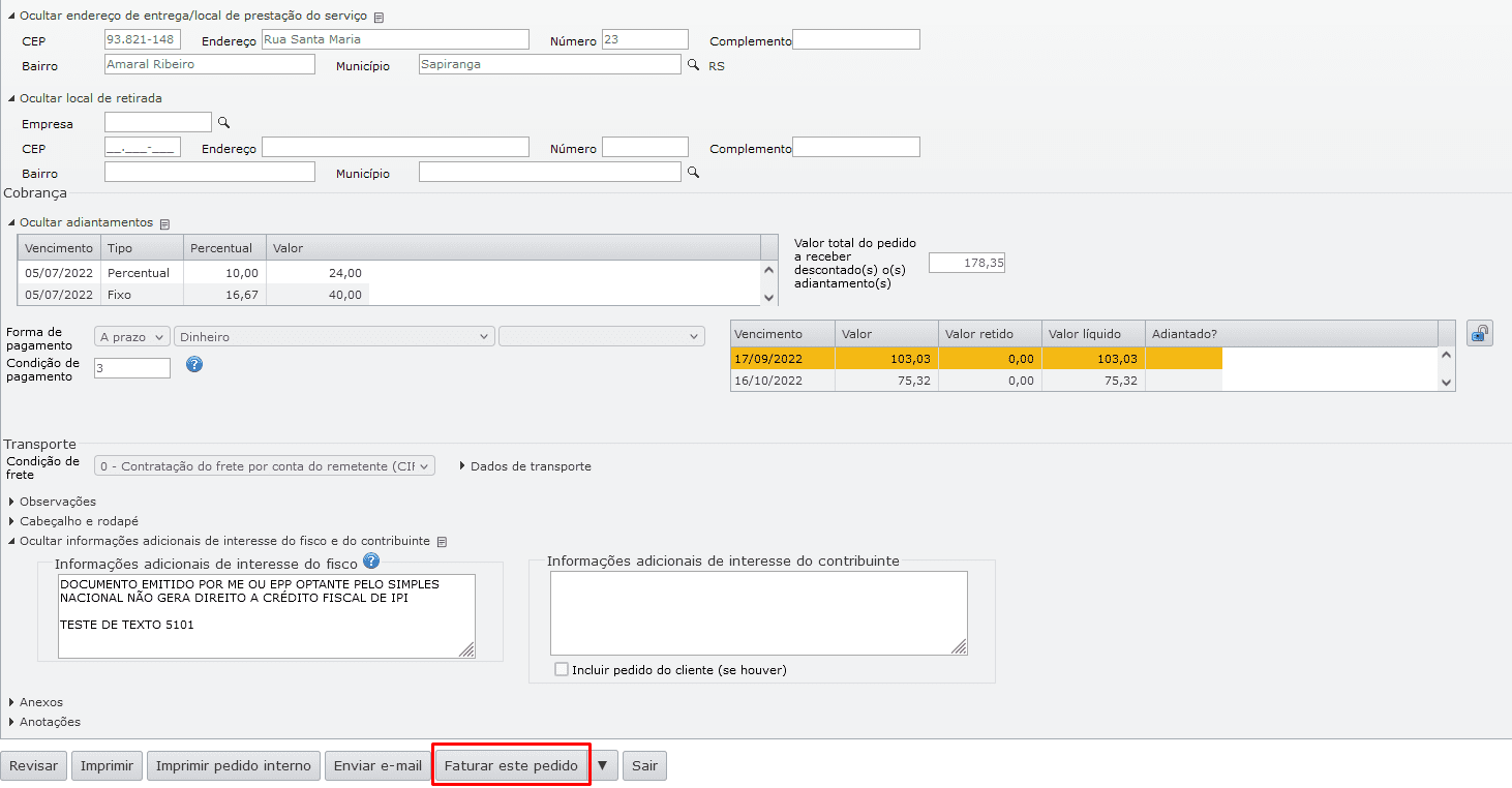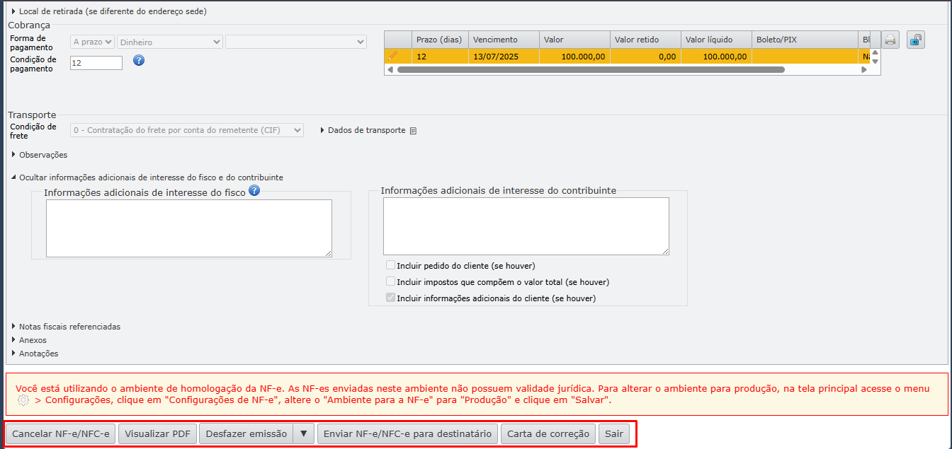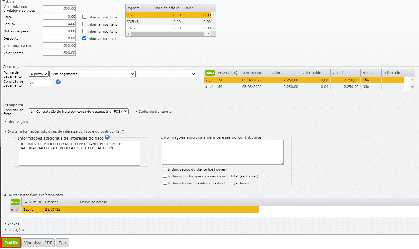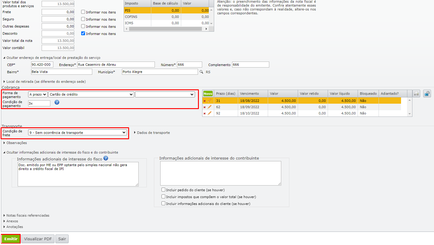 7) Preencha os dados de cobrança e transporte e clique em “Emitir”.