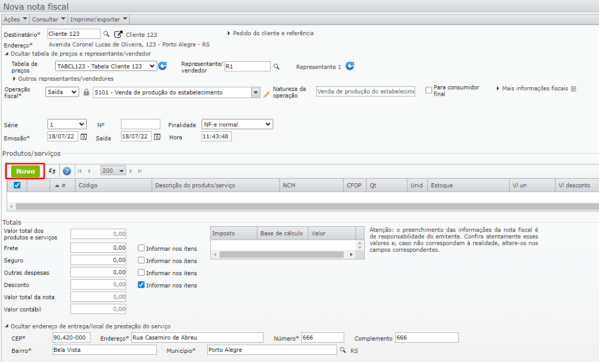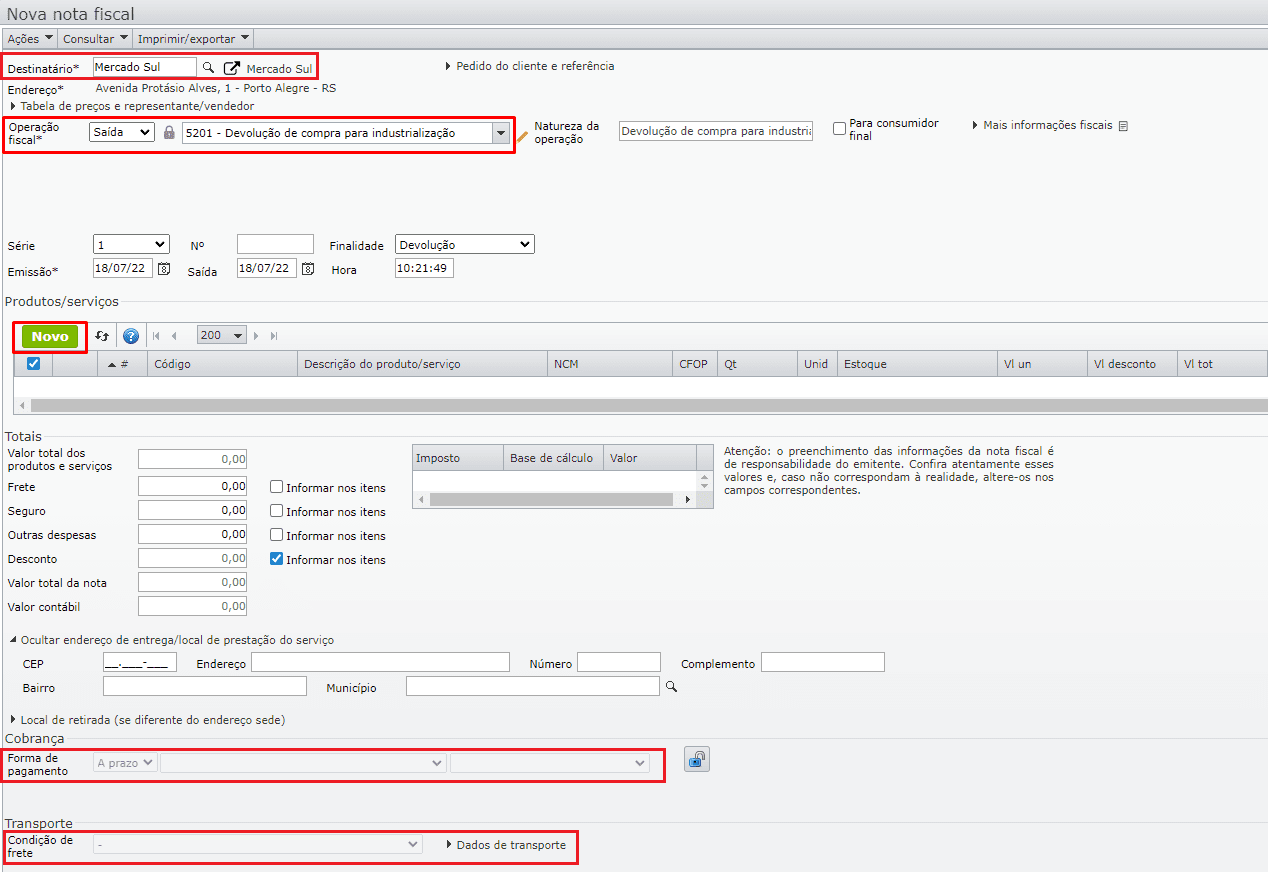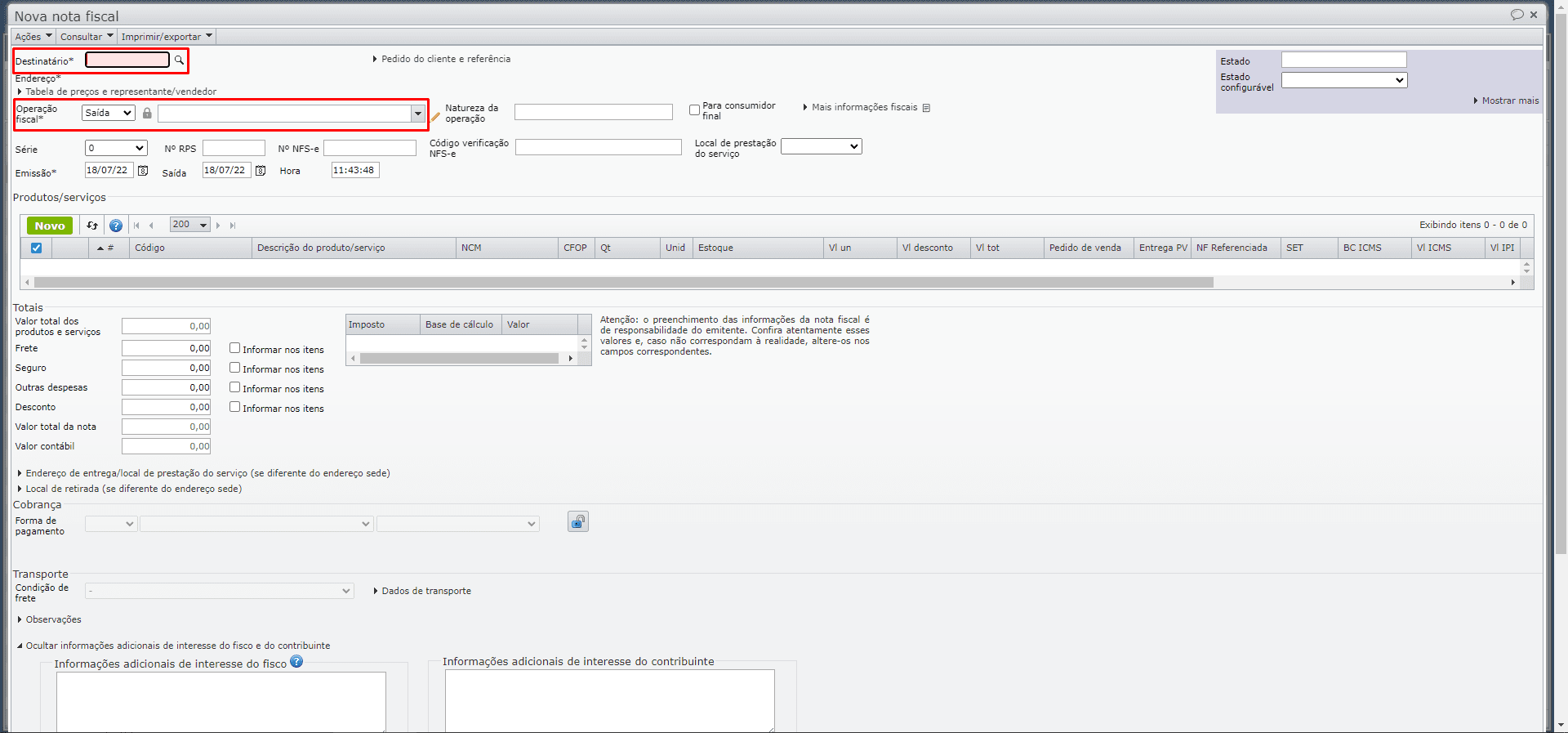 3) Preencha os campos obrigatórios, tais como “Destinatário”, “Operação fiscal”, os produtos/serviços, “Forma de pagamento” e “Condição de frete”.
