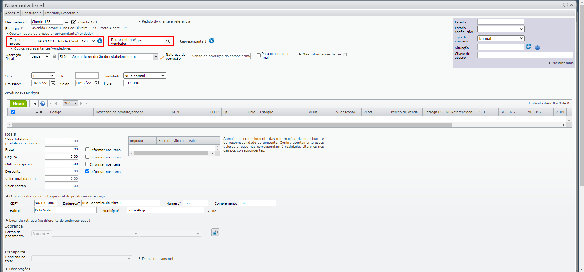 5) Opcionalmente, selecione a tabela de preços e o representante. Veja aqui como cadastrar tabelas de preços e representantes.