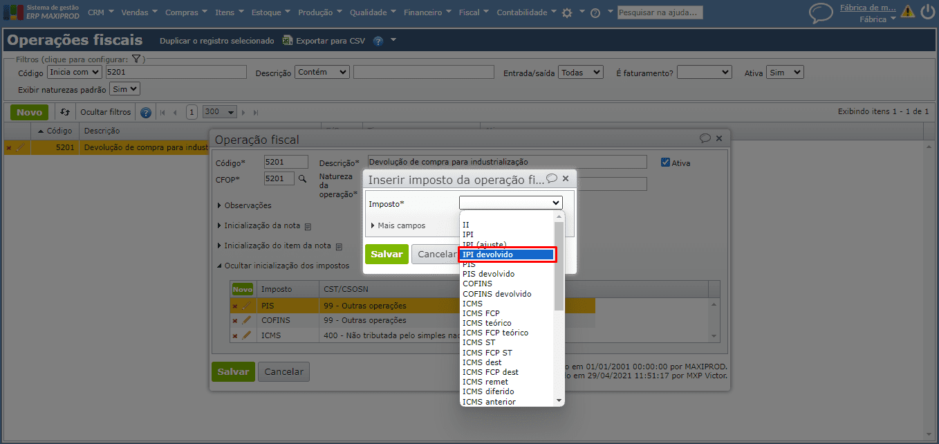 e) Após ajustar os impostos, clique em “Salvar” para guardar as alterações.