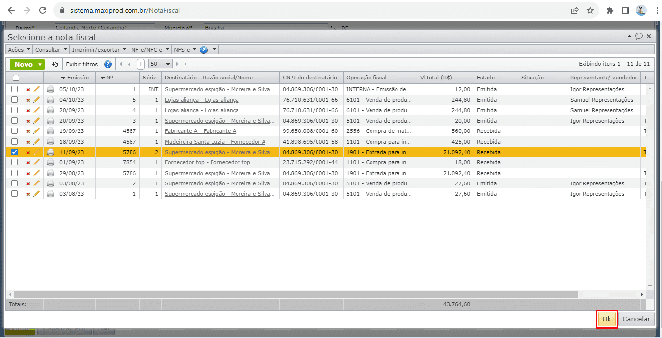 b) Selecione as NFs referenciadas e clique em “Ok” no canto inferior direito da janela aberta.