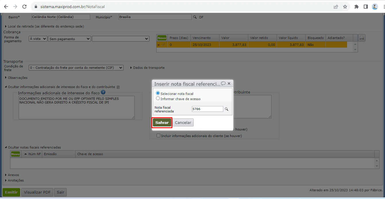 5) Selecione a opção “Informar chave de acesso”. Digite a chave da NF original e clique em “Salvar” para guardar as alterações.