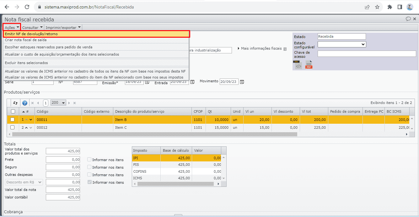 - Impostos sobre a devolução total: se a devolução for de todos os itens de uma NF, geralmente os impostos associados à nota de devolução serão os mesmos da NF original.