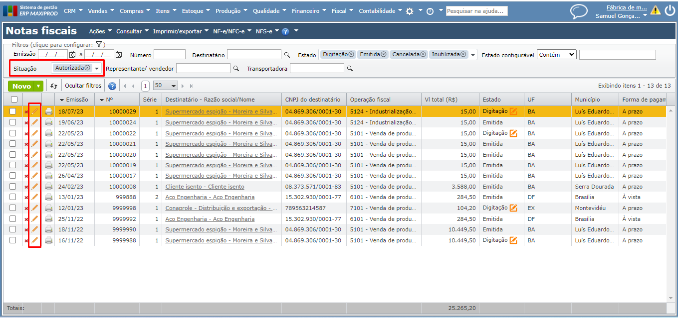 2) Localize na grade a NF-e a ser cancelada, e clique no ícone do lápis para editá-la.