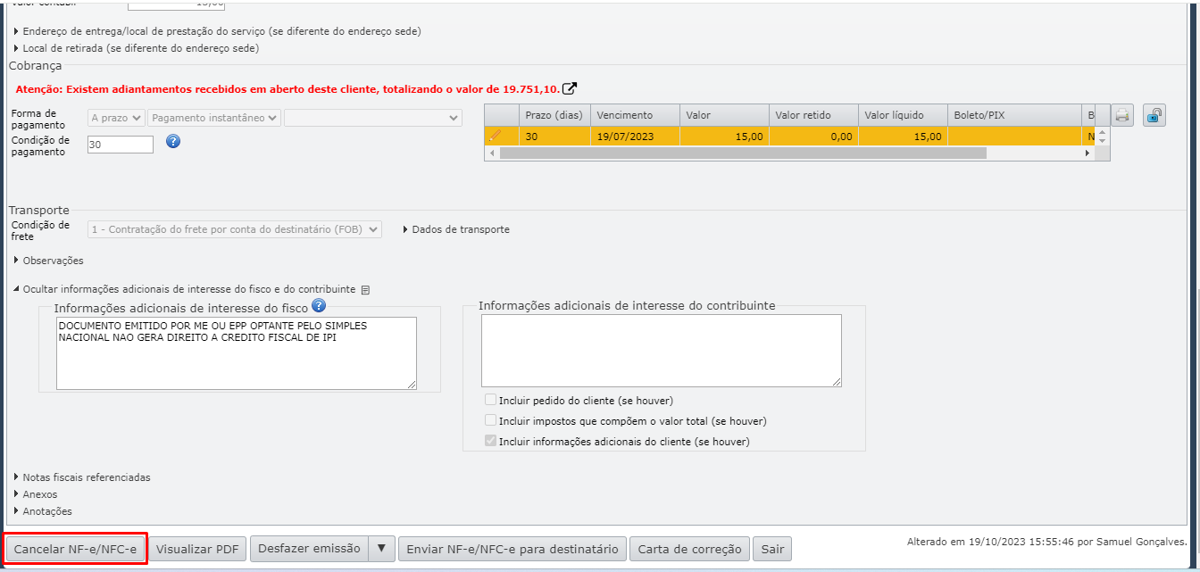 3) Se a NF-e está no estado “Emitida”, vá até o rodapé da tela de edição e clique no botão “Cancelar NF-e/NFC-e”.