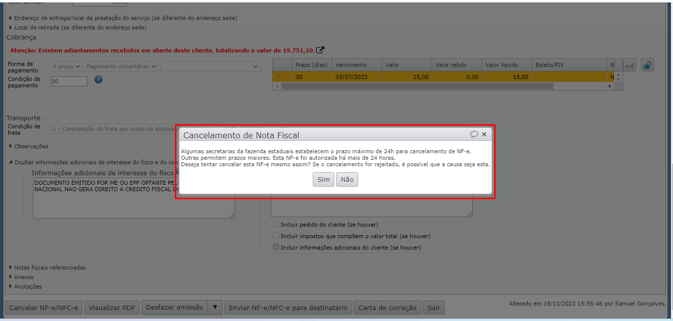 Deseja tentar cancelar esta NF-e mesmo assim? Se o cancelamento for rejeitado, é possível que a causa seja esta."