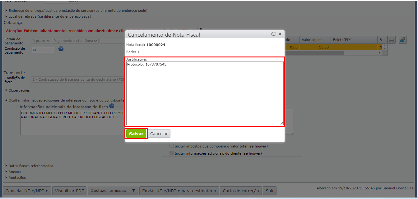 5) No campo “Justificativa” informe o protocolo gerado no portal por onde foi solicitado o cancelamento extemporâneo. Ou insira a justificativa conforme as instruções do portal da NF-e. Clique em “Salvar” para efetivar o processo.