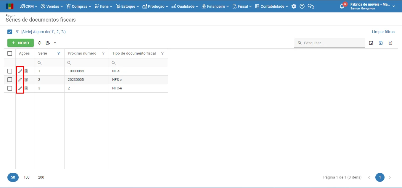 3) Abra a tela de edição da série fiscal clicando no ícone do lápis ou com um duplo-clique na linha.