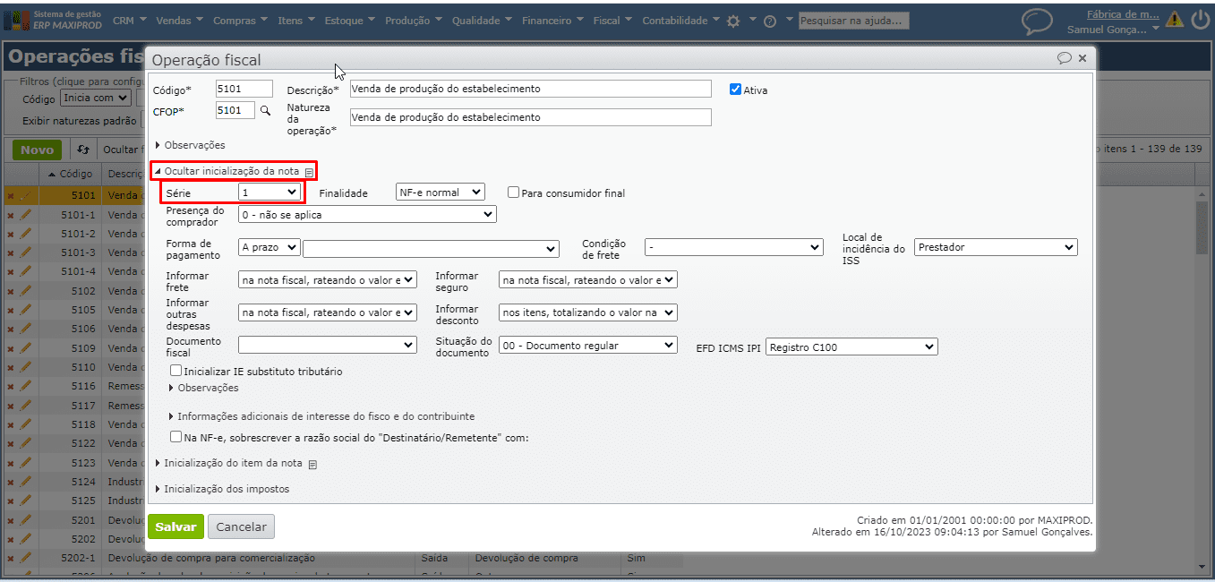 1) A série fiscal é inicializada pela operação fiscal, ou seja, para cada operação fiscal pode-se definir a série fiscal a ser inicializada automaticamente nas NF-es. Para isso, edite a operação fiscal, expanda a seção “Inicialização da nota” e preencha o campo “Série”. Para saber mais sobre operações fiscais, clique aqui.
