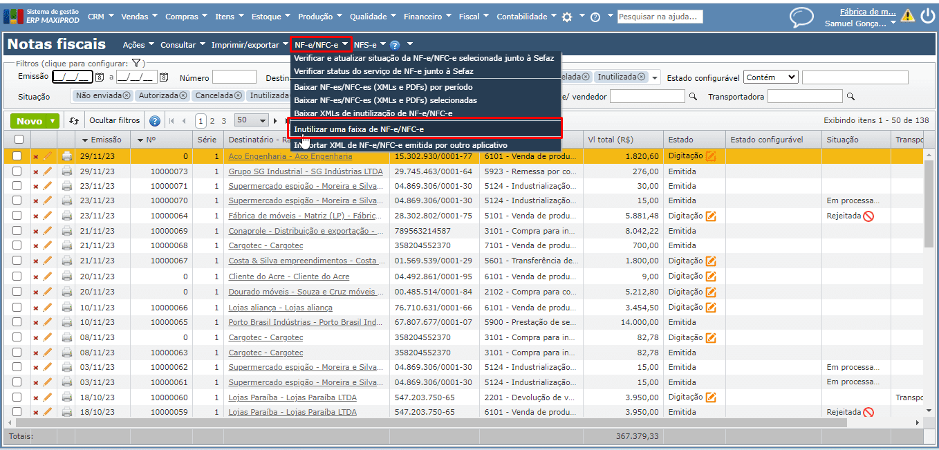 2) A seguir, na tela de notas fiscais, clique no menu “NF-e/NFC-e > Inutilizar faixa de numeração de NF-e/NFC-e”.