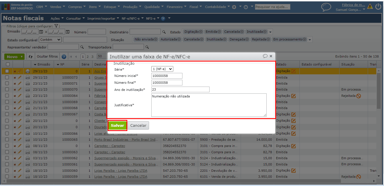 Quando a sequência da numeração da série fiscal é quebrada, ou seja, uma determinada numeração ou faixa de numeração não é utilizada, mas não é possível reaproveitar esta numeração por haver notas com numeração subsequente transmitidas para a Sefaz, o usuário deve inutilizar o número ou faixa de números não utilizada. Para mais informações sobre a inutilização de faixa de número de NF-e/NFC-e, clique aqui.