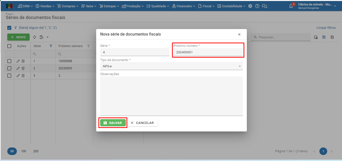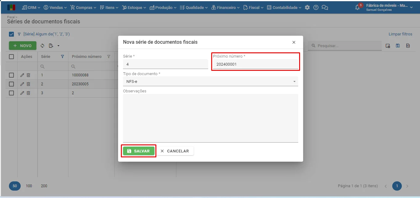 4) Altere o valor do campo “Próximo número” e clique no botão verde “Salvar” para guardar as alterações. Lembre-se de que a Sefaz exige numeração sequencial para a série fiscal. Portanto, altere o próximo número somente quando necessário e sob orientação do supervisor ou do escritório de contabilidade.