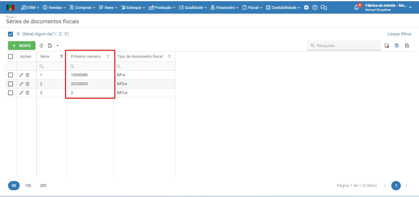 1) Quando a NF-e é excluída após ter sido emitida, portanto após ter recebido numeração, se não houver outras notas com numeração subsequente, o sistema retorna automaticamente o próximo número da série fiscal. Porém, para reaproveitar a numeração da NF-e excluída, confira se o próximo número da série fiscal foi atualizado.