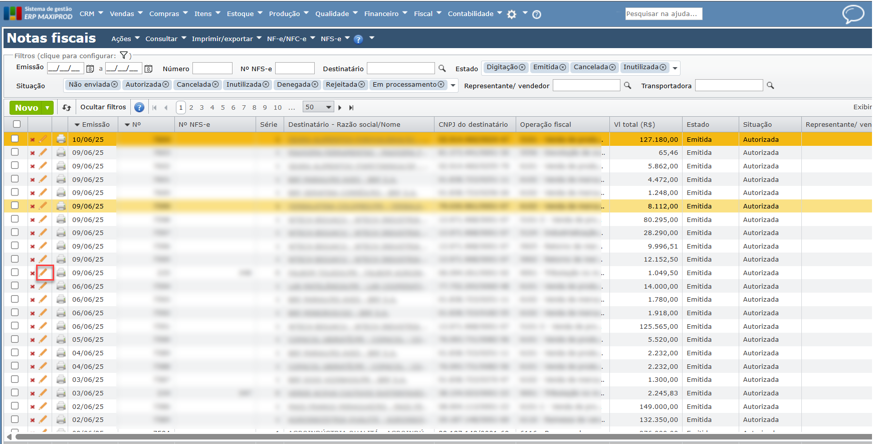 3) Clique no ícone de lápis para abrir os detalhes da NFS-e.