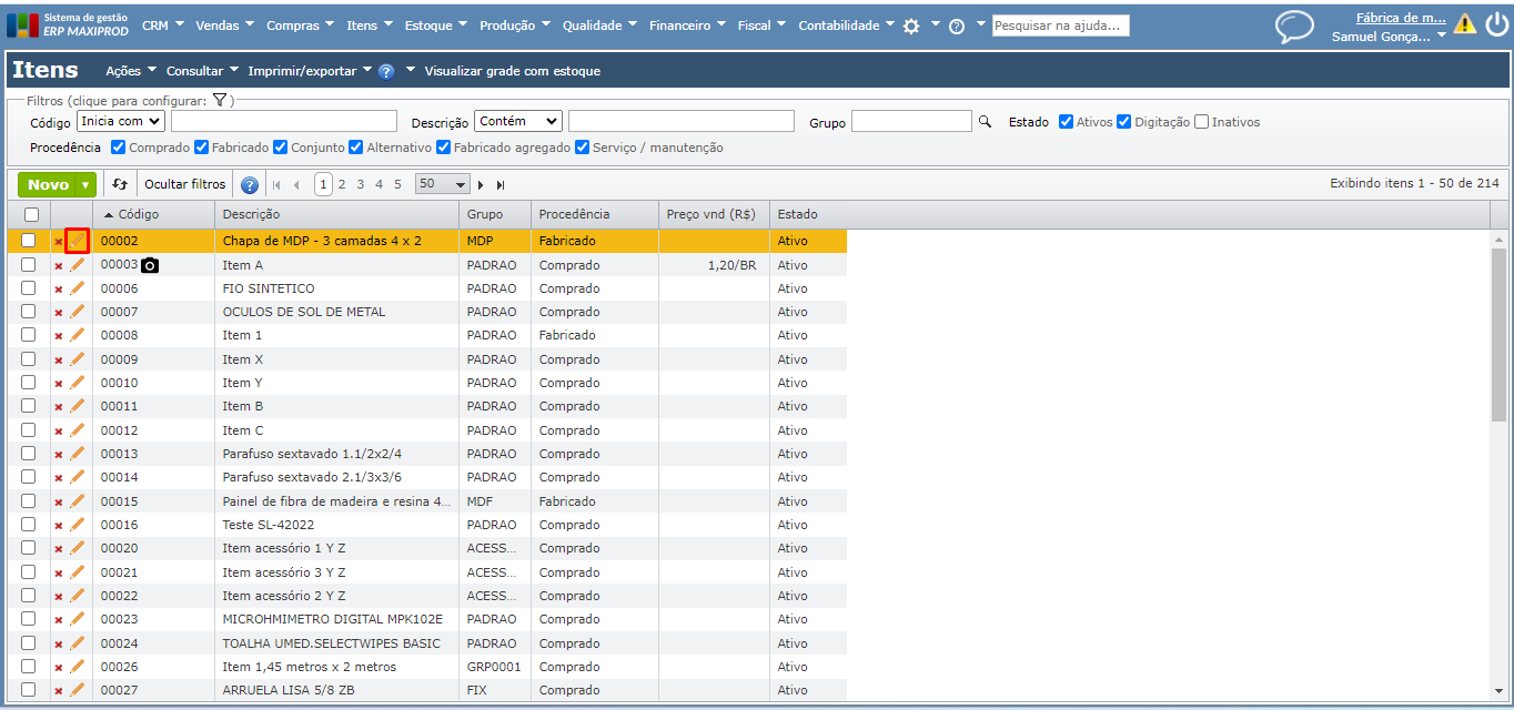 2) Localize o cadastro do item na grade de itens, e clique no ícone do lápis para editá-lo.