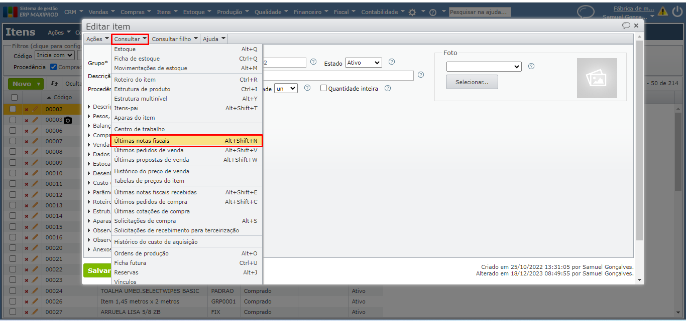 3) Para acessar as notas fiscais emitidas do item, através da edição do item, utilize o menu “Consultar > Últimas notas fiscais”.