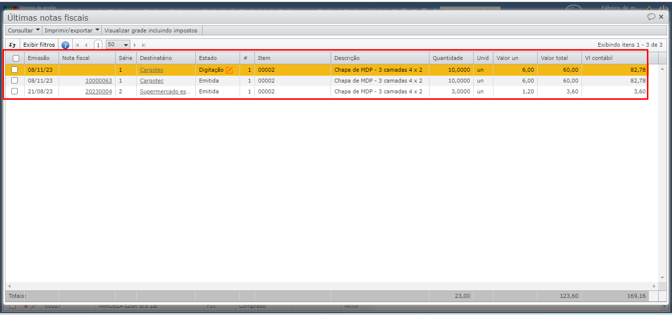 a) É aberta uma grade com todas as NFs emitidas que contém este item.