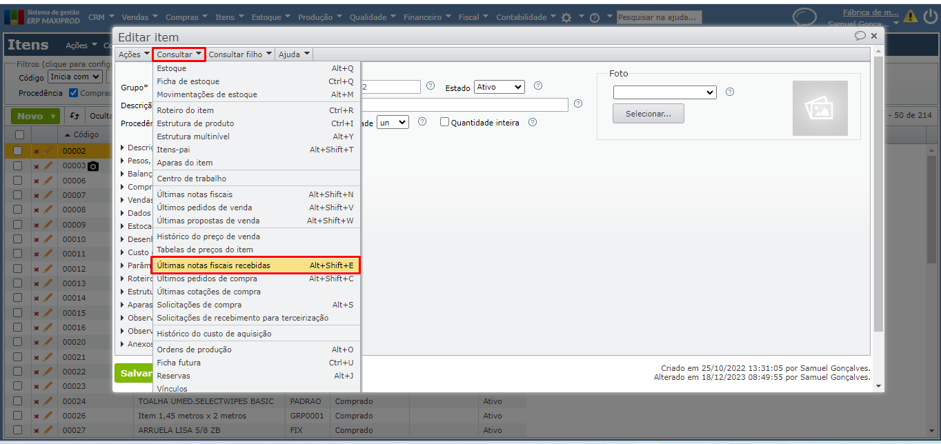 4) Para acessar as NFs recebidas do item, através da edição do item, utilize o menu “Consultar > Últimas notas fiscais recebidas”.
