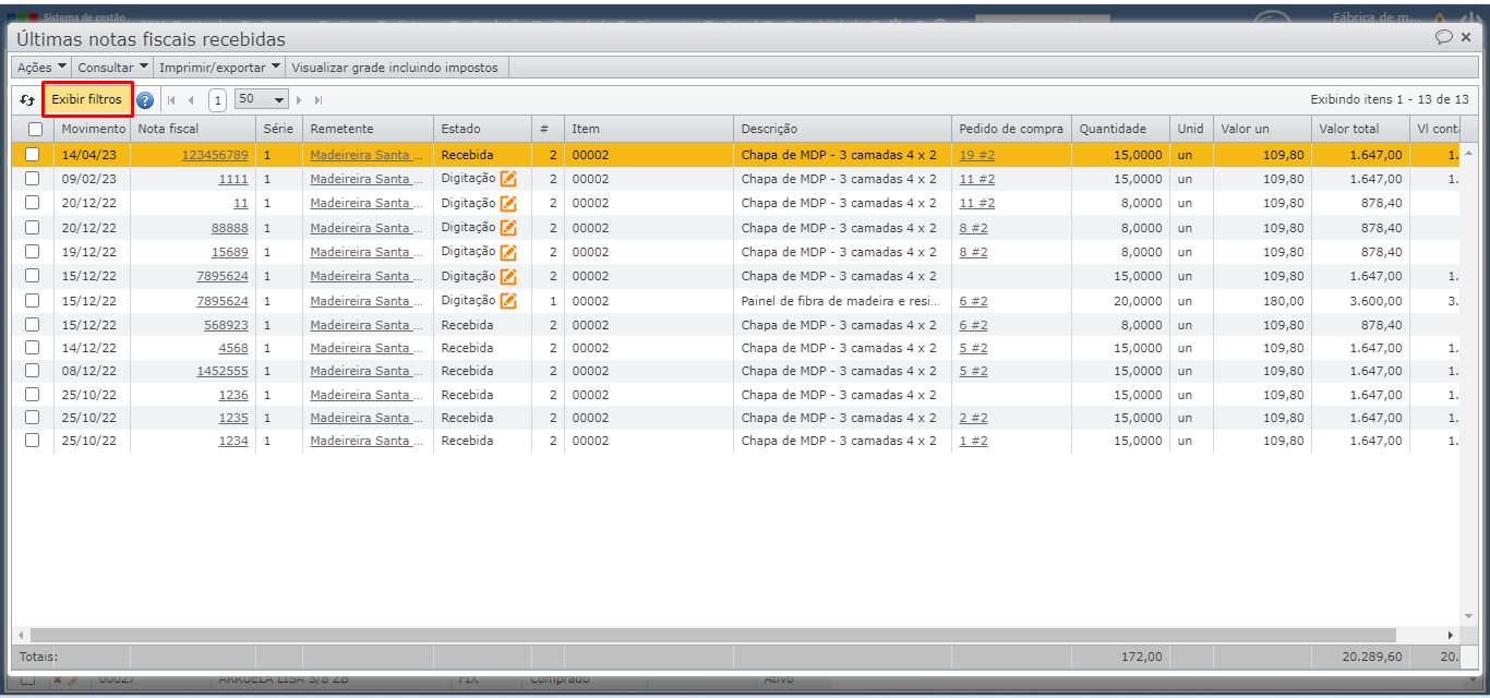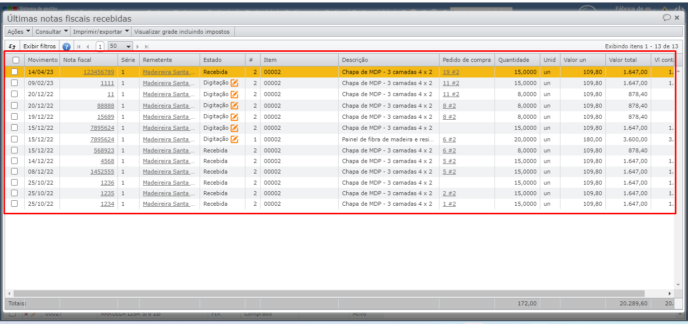 a) É aberta uma grade com todos as NFs recebidas que contém o item.