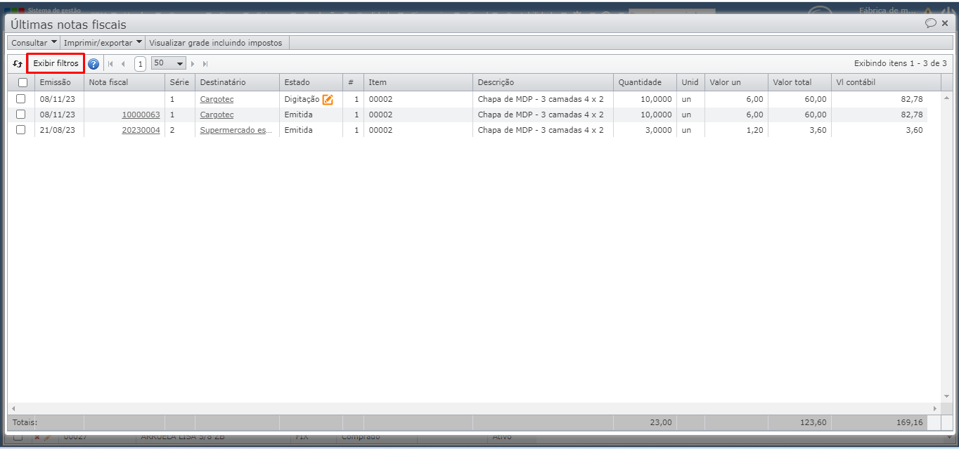 b) Clique na opção “Exibir filtros” e especifique os filtros necessários, como por exemplo “Emissão”, para definir o período da busca.