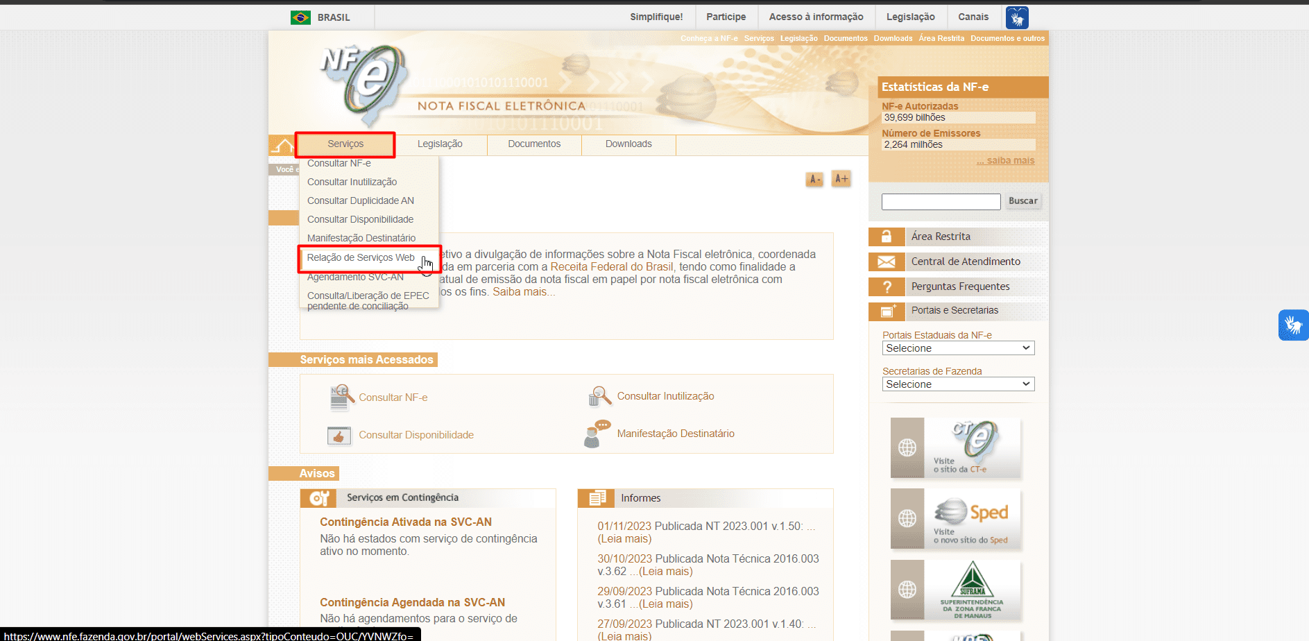 1) Identifique a URL do Webservice acessando o menu “Serviços >  Relação de Serviços Web”.