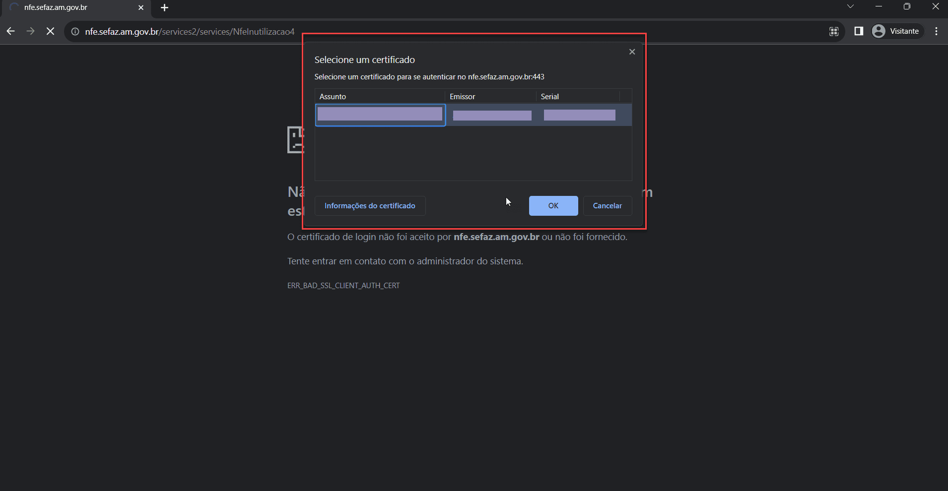 4) É exibida uma janela para seleção do certificado digital a ser utilizado para a consulta. Selecione-o e clique no botão azul “Ok“.
