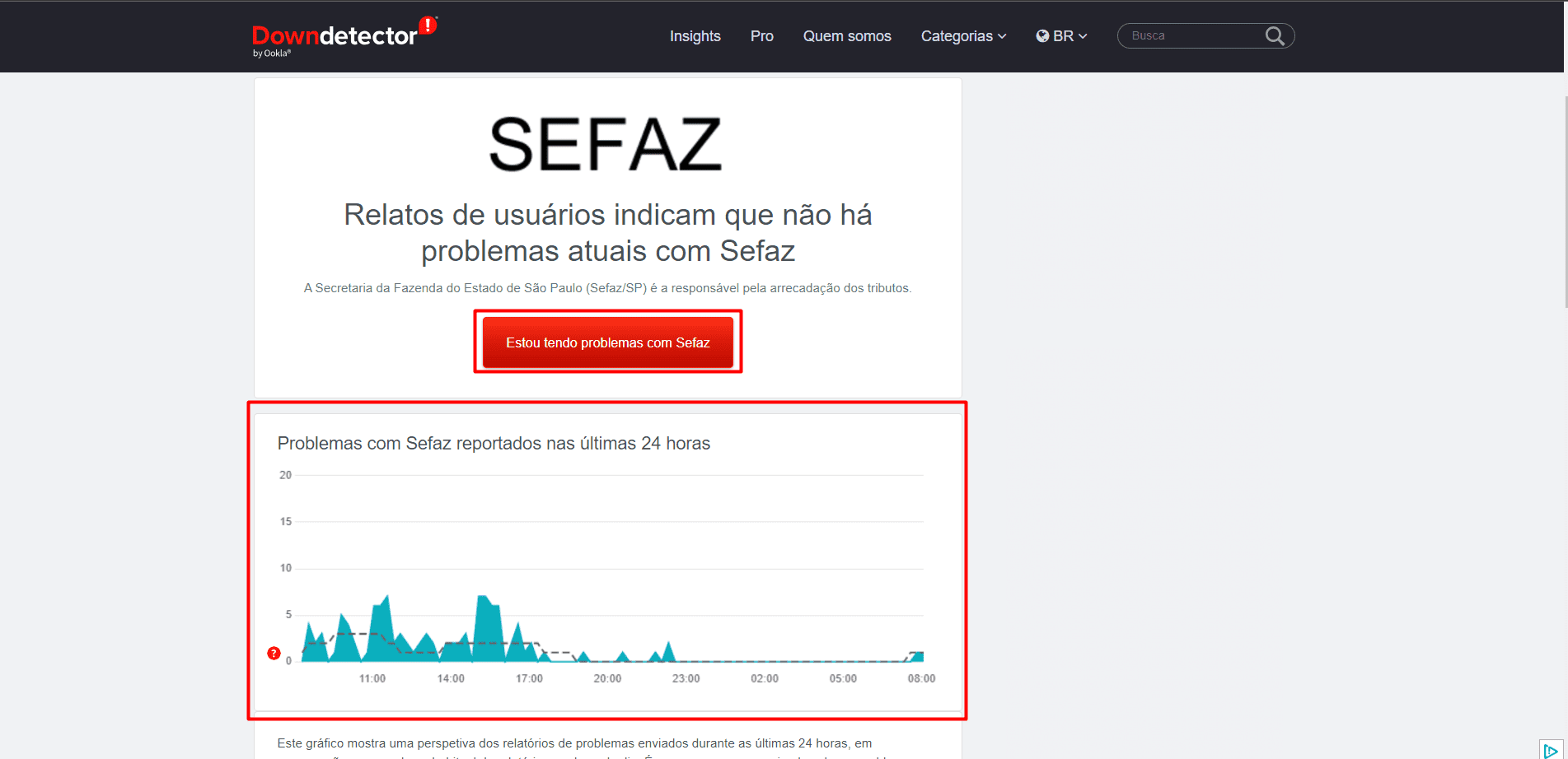 2) Agora, arraste o conteúdo da tela para baixo, até encontrar o gráfico “Problemas com Sefaz reportados nas últimas 24 horas“. Também é possível relatar um problema na Sefaz clicando no botão vermelho “Estou tendo problemas com Sefaz“.