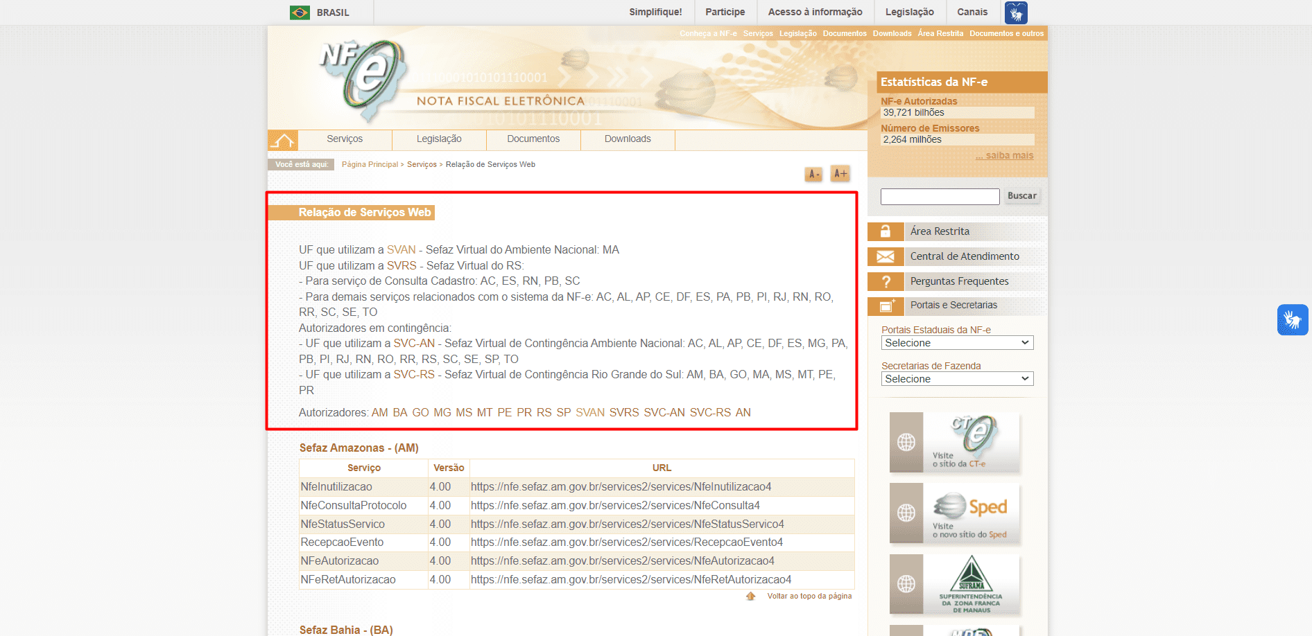 2) São listadas as URLs dos Webservices dos ambientes autorizados. Na parte superior da página é mostrada uma legenda que identifica as URLs de cada ambiente. Procure seu ambiente autorizador.