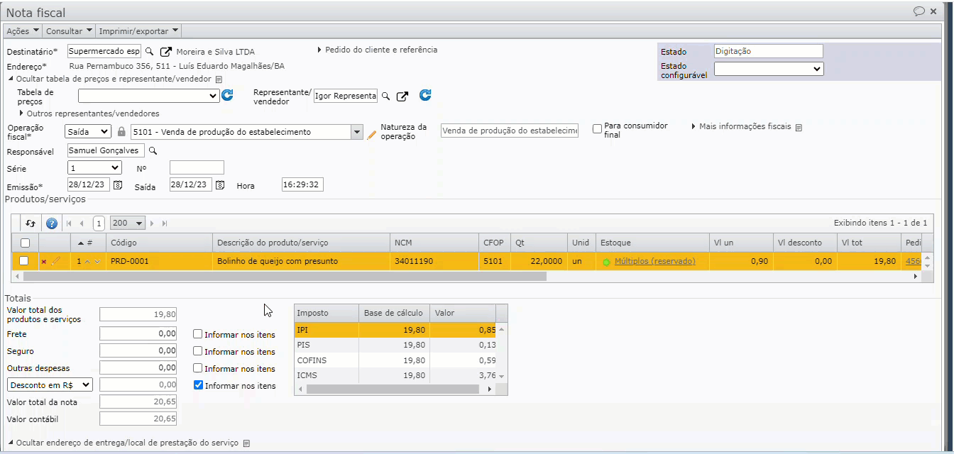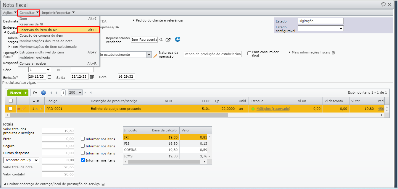 2) Se a quantidade estiver incorreta, ajuste para a quantidade correta. Em seguida, após se certificar de que a quantidade do item está correta, acesse as reservas do item para esta nota fiscal, isso pode ser feito através do menu superior “Estoque” > opção “Reservas”, ou selecionando o item na grade e acessando o menu “Consultar > Reservas do item da NF”.