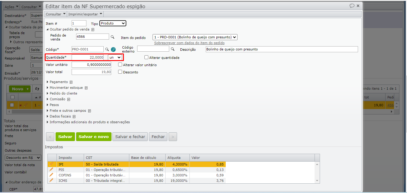 1) Verifique se a quantidade do item na nota fiscal está correta. Acesse a grade de produtos e serviços da nota fiscal e verifique o campo “Quantidade” na edição do item.